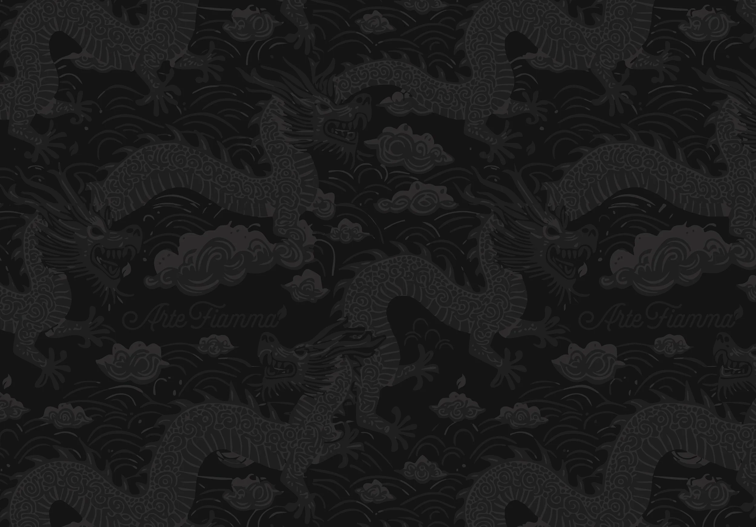 White candle with black and gray fish illustrations and the text "Arte Fiamma" on a wooden surface.