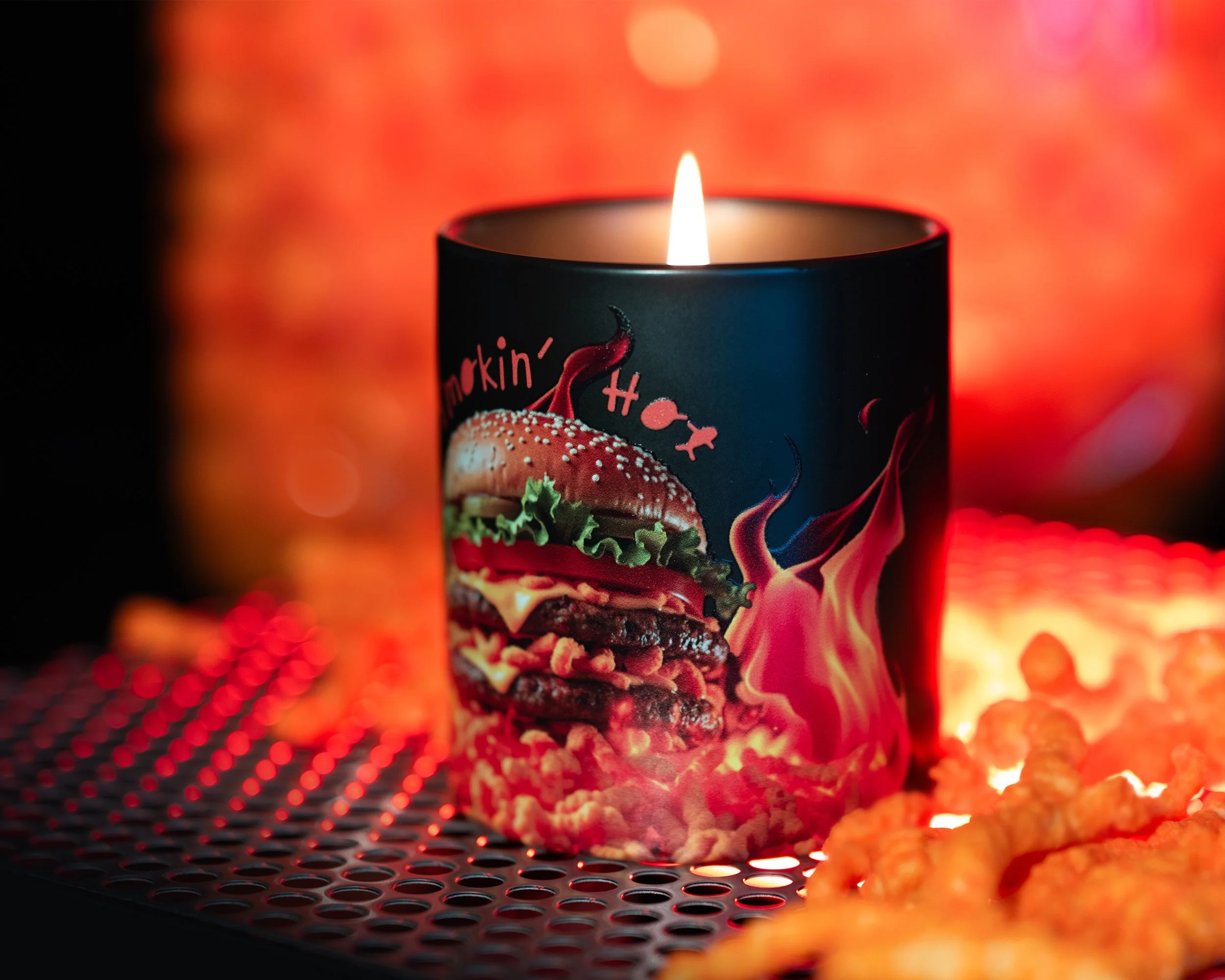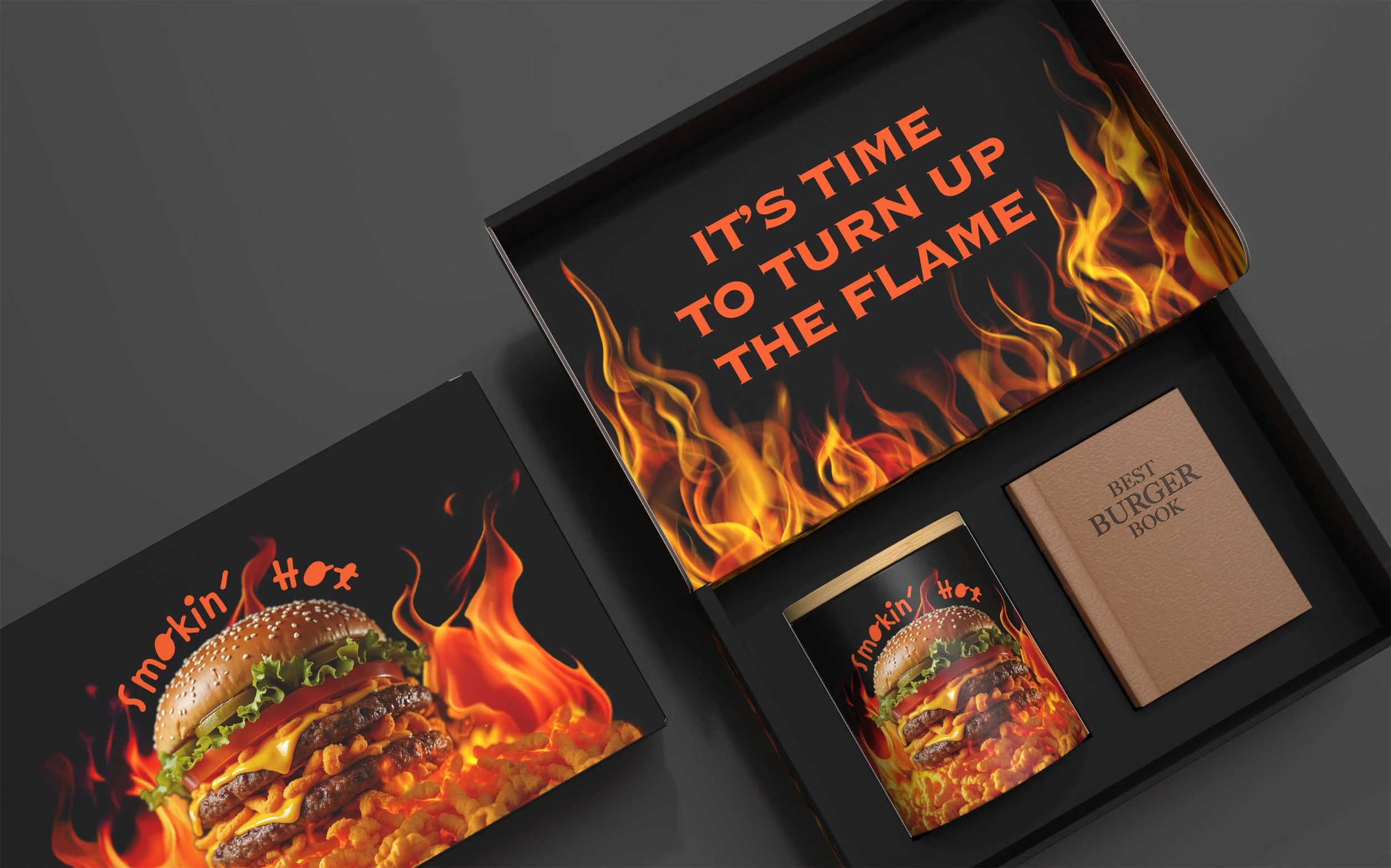 Arte Fiamma - Custom Candle gift set with a burger-themed vessel and a recipe book merch titled 'Best Burger Book'. Media Mailer packaging features flames and text 'It's time to turn up the flame' and a burger graphic with the phrase 'Smokin' Hot'.