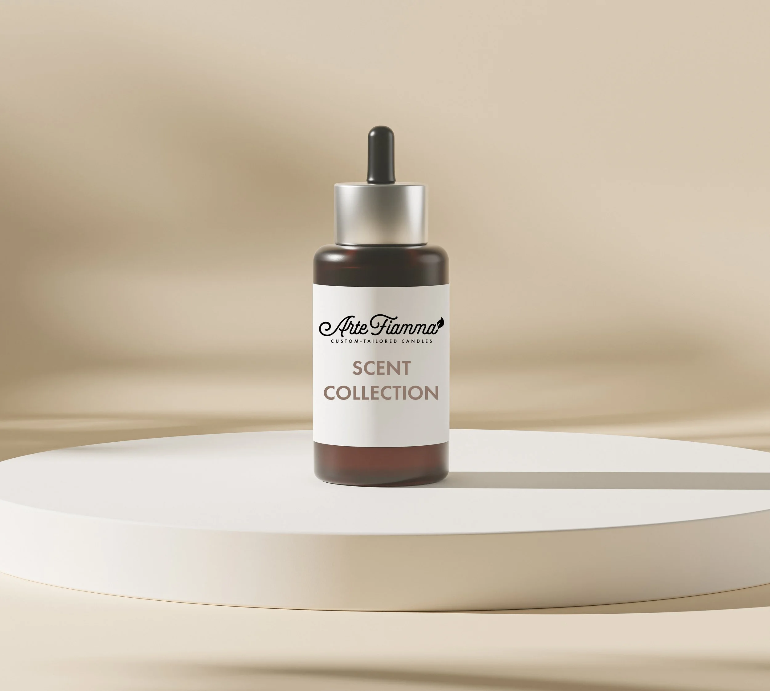 A brown glass bottle with a dropper cap labeled 'Arte Fiamma Scent Collection' placed on a white oval platform against a beige background.