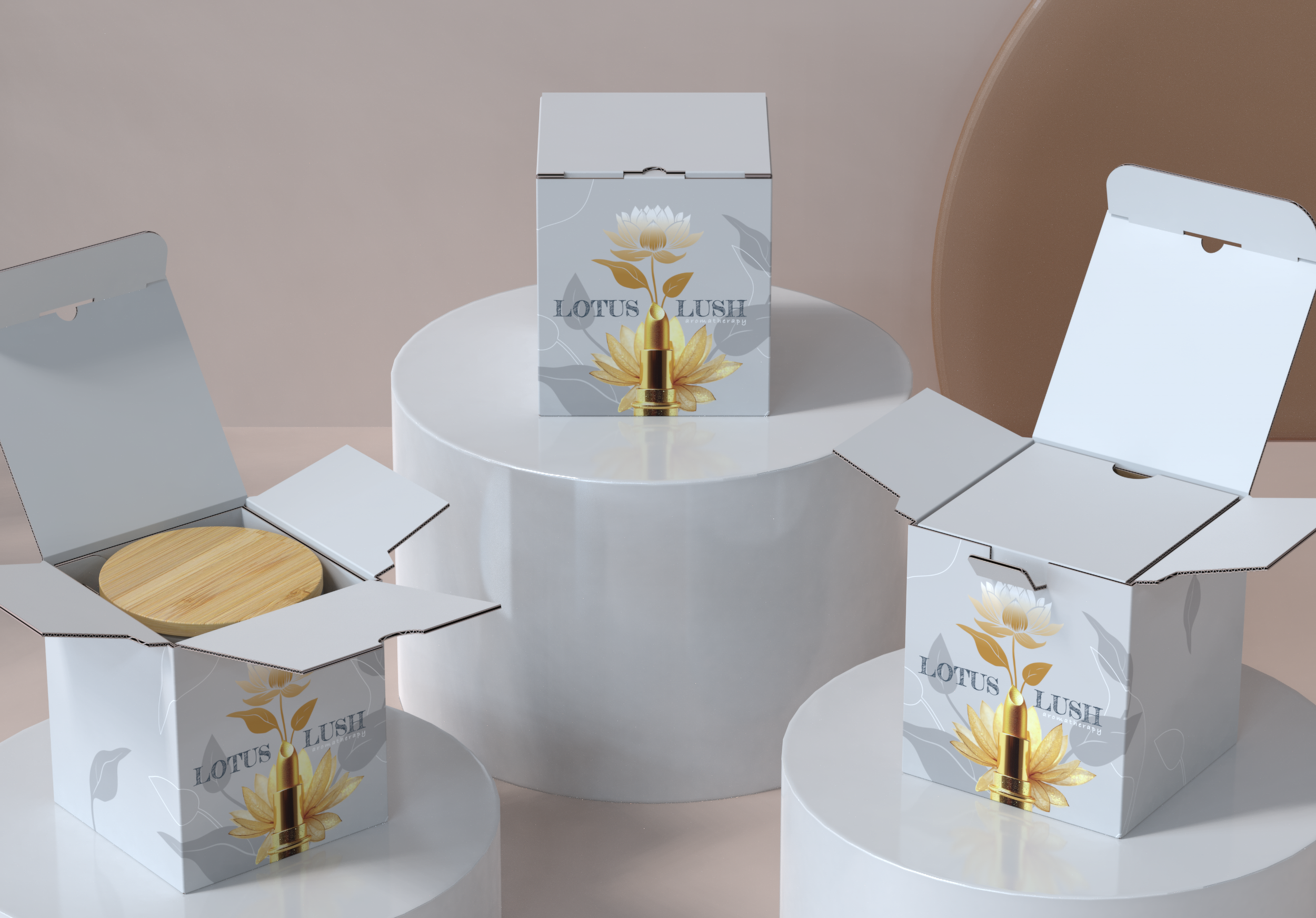 Three white boxes labeled 'Lotus Lush' with a lotus flower and lipstick design, one open revealing a round wooden object inside, placed on white and beige cylindrical platforms.
