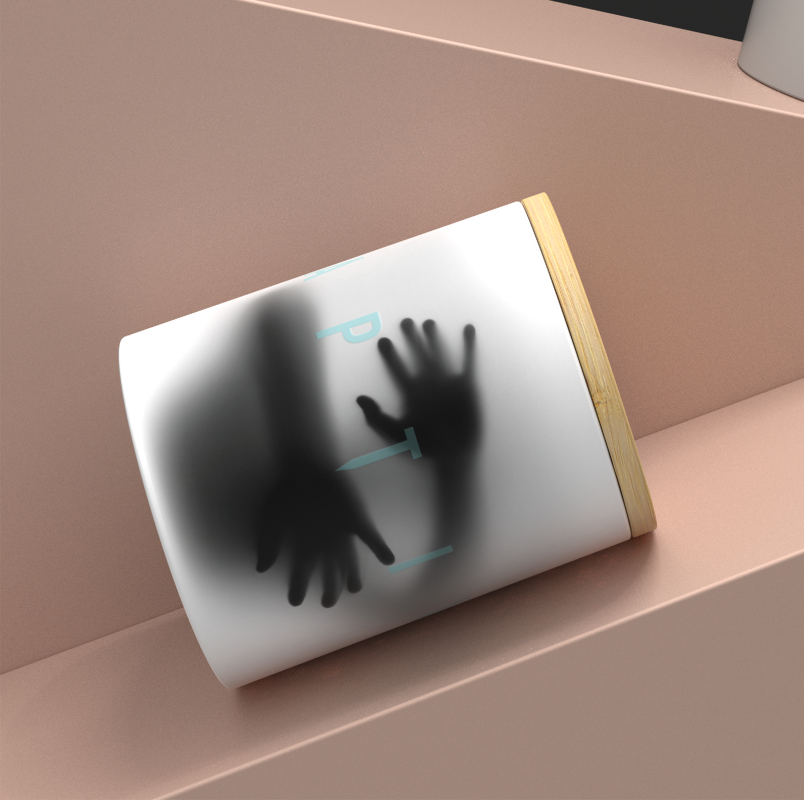 Silhouette of two hands pressed against a frosted glass pane on a white book with a wooden spine, placed on a pink shelf.