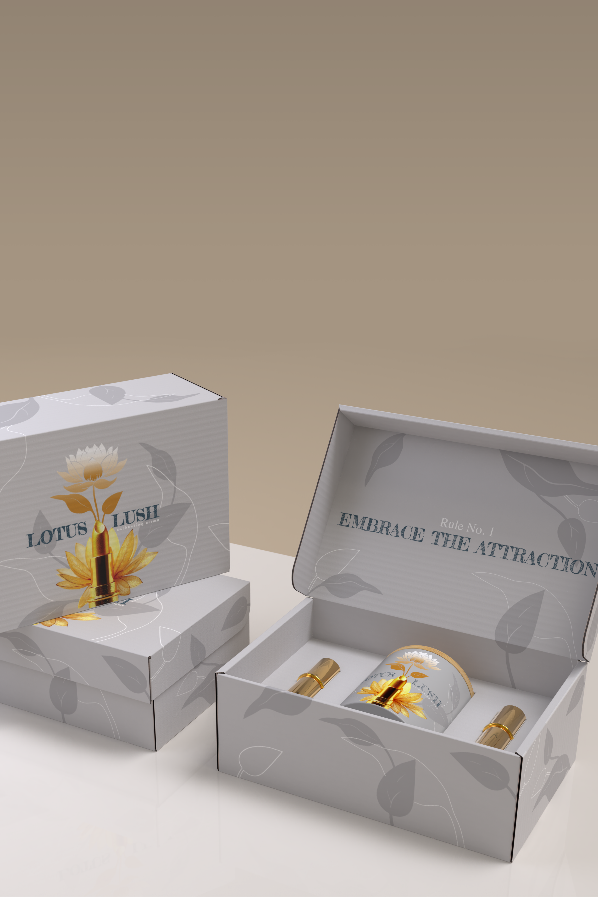 Open white box with gold tubes and cream labeled 'Lotus Lush' and slogan 'Embrace the attraction' inside, beside a closed matching box, both with floral design.