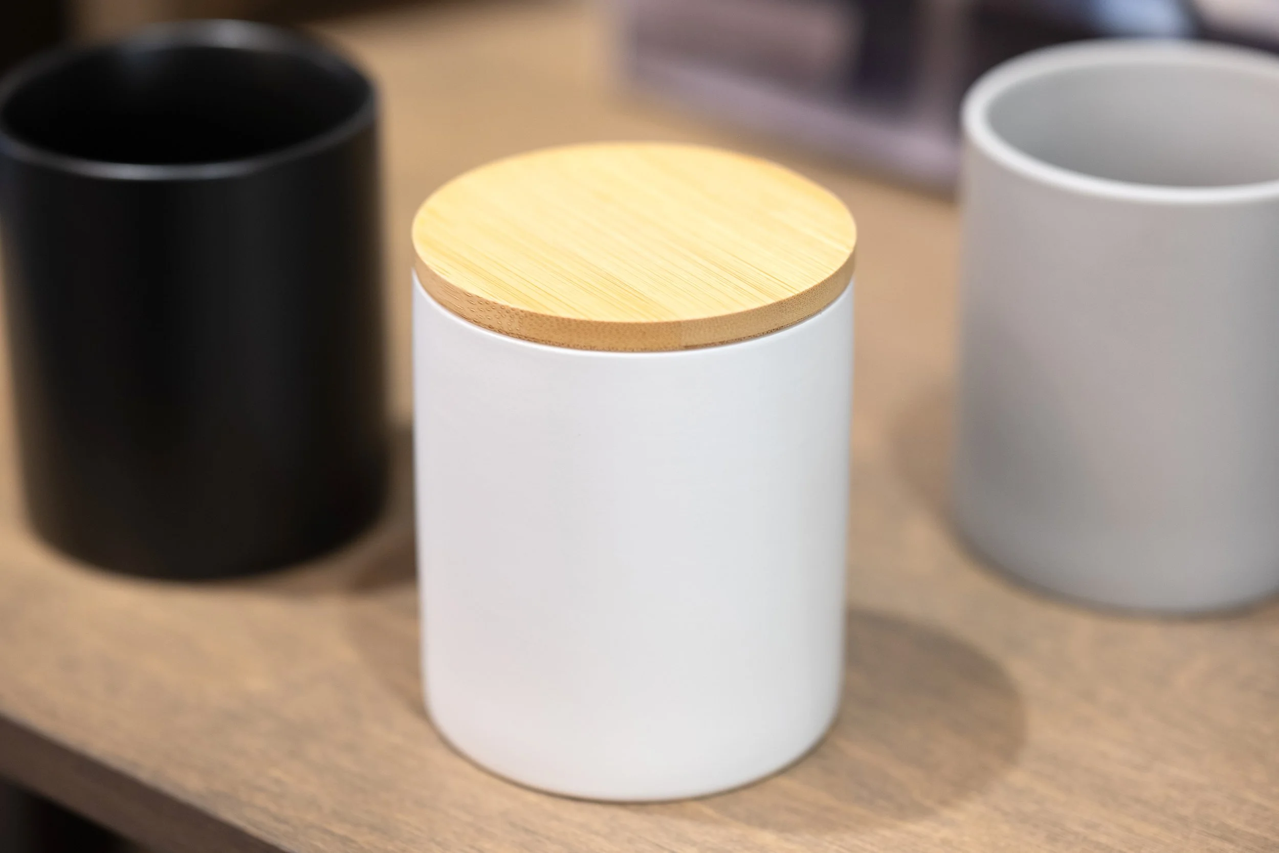 A white cylindrical diffuser with a wooden lid, accompanied by black and gray cups on a wooden surface.