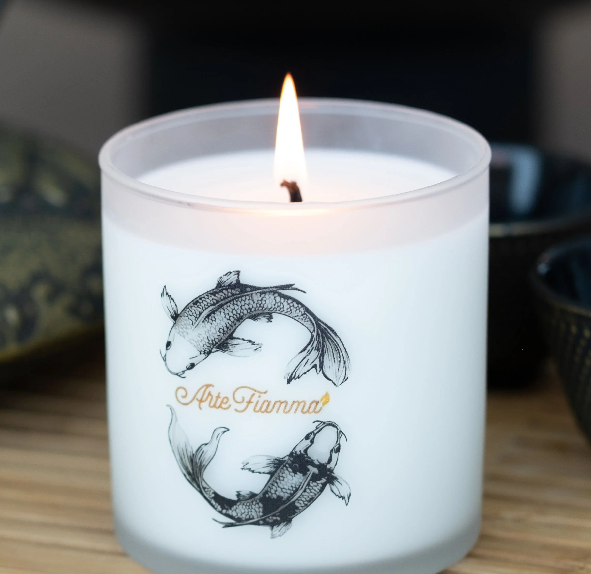 White candle with black and gray fish illustrations and the text "Arte Fiamma" on a wooden surface.
