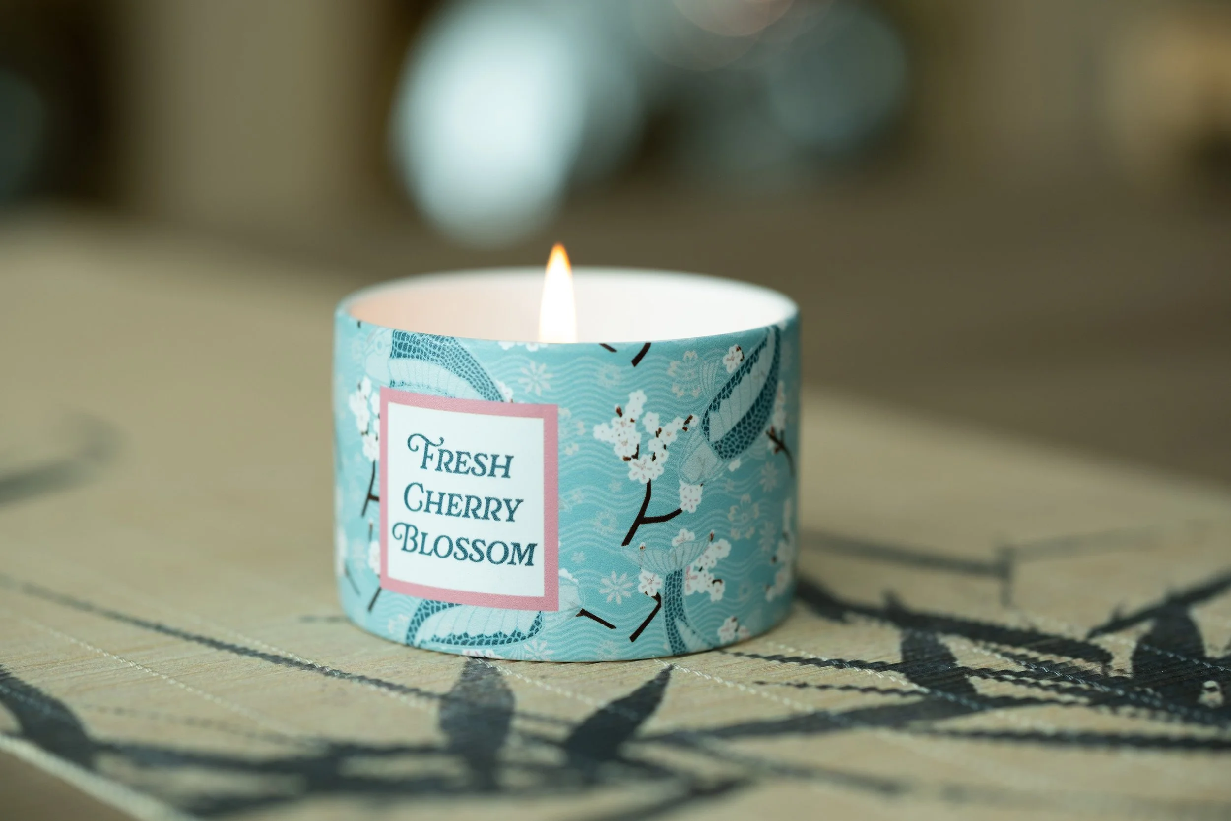 Custom small-batch candle featuring full wraparound print designs and custom candle scent.